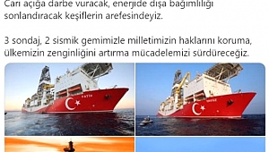 Hazine ve Maliye Bakanı Berat Albayrak, "Her alanda tarihi atılımların ve büyük ideallerin gayretindeyiz. Cari açığa darbe vuracak, enerjide dışa bağımlılığı sonlandıracak keşiflerin arefesindeyiz. 3 sondaj, 2 sismik gemimizle milletimizin haklarını koruma, ülkemizin zenginliğini artırma mücadelemizi sürdüreceğiz." dedi.
